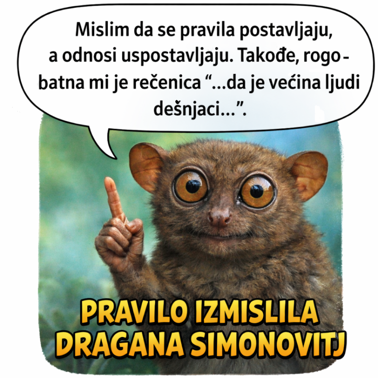 (Ovo i ovako izrečeno “pravilo” je navedena profesorka koja je želela da ostane anonimna izjavala na jednoj televiziji pred ostalim urednicima i novinarima ovako uz značajno podignuti kažiprst. Nova u redakciji, tek završila fakultet i zaposlila se. Ostali u redakciji zanemeli. Nema sumnje da je ona to pravilo izmislila tu i možda baš tom prilikom, ali se postavlja pitanje zašto. Pa zato da bi stekla autoritet kod novih kolega i pokazala da je ona ta koja je ovde došla kao stručnjak za jezik.