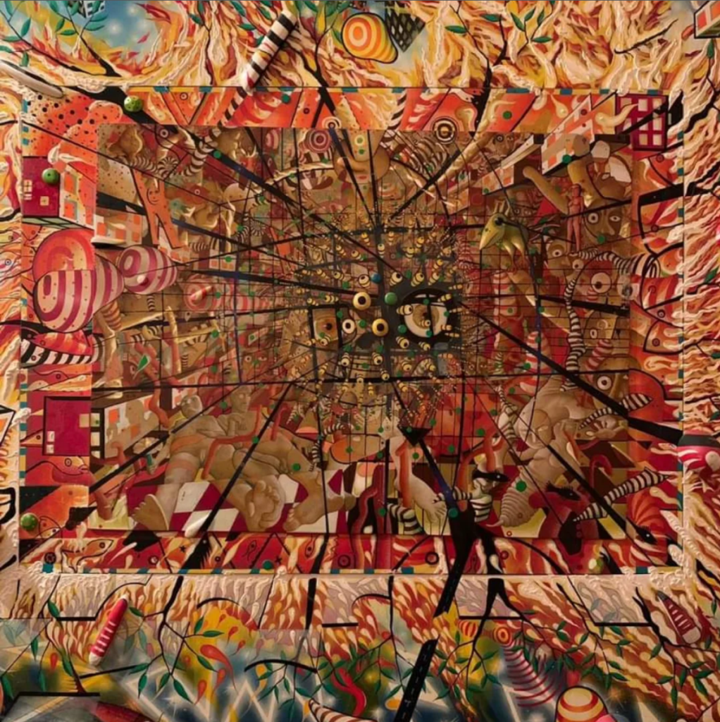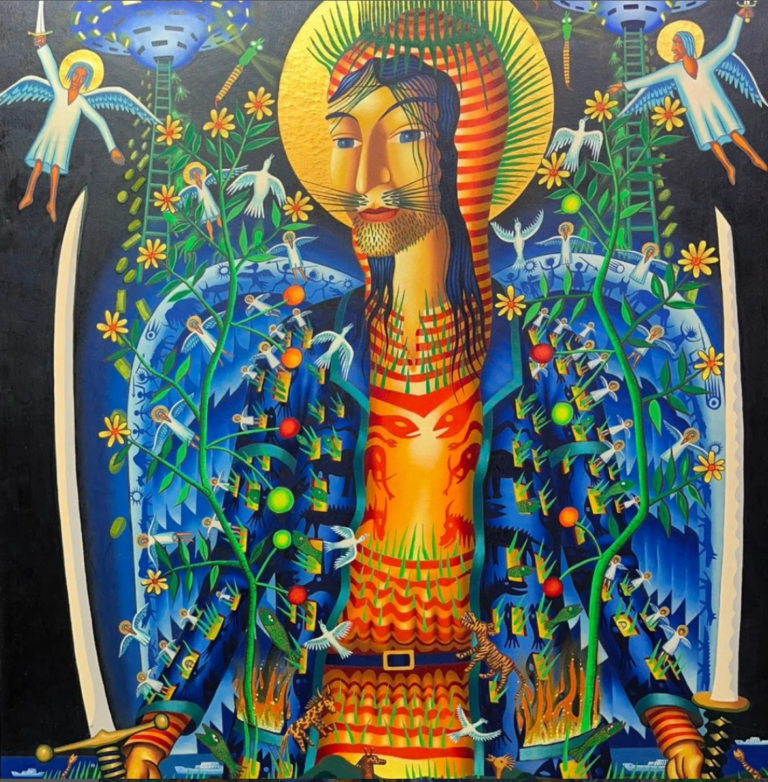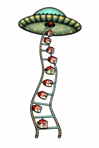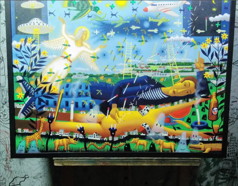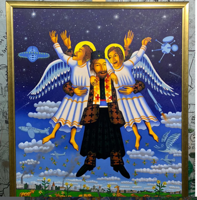Ali da se vratimo ovoj slici, ovom remek-delu. Osim cvetova sa simbolima Zodijaka i nekim drugim izmišljenim znakovima u starkama, Radović se dosetio ovde i invazije vanzemaljaca preko letećeg tanjira NLO tipa koji lebdi iznad Beograda, tačno tamo negde iznad Saborne crkve i preko onih improvizovanih merdevina kakve se koriste za helikoptere i za potrebe snimanja filmova o Indajana Džounsu, istovaruje kuće od kojih svaka ima zaseban izraz fasade.