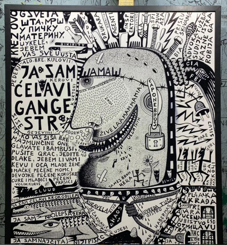 Svi znaju za Radovića, ali ga ne znaju svi pod istim imenom. On je patio od teškog oblika pseodonimomanije. Tada mi ga je Tobić usput predstavio kao Magičnog Čiču, a i on je sam sebe u to vreme zvao Čiča. Već tokom te večeri se pojavio i pod imenom Slikator, što je u redu. I to je dobro, ali onda je krenulo dalje ređanje. Te nije više Magični nego Matični Čiča, pa onda Čiča iz Rija, te Zuja iz čista mira, pa onda čak i Dragan jer neko ga je i po imenu zvao, ali takvi su bili retki, ali zanimljivo je da je na svim radovima koje sam imao od njega, a jedan je završio kod Bešketa (Vojislav Bešić) kad sam shvatio da mi je lakše da mu poklonim tu sliku nego da ga mesecima molim da mi je vrati, svuda stoji potpis Radović. Na ovom Čovexu piše i latinicom i ćirilicom, ali s druge strane slike. A i logično je da bude Radović čovek koji pravi radove. Šta tu ima da se izmišljaju pseudonimi? Tu je i Ivana Gačanović koja je, kako reče, njegova koleginica. Kako koleginica kad je ona antropolog? I tako sam saznao možda i prvi put otkako ga znam da je on završio etnologiju. A etnolozi i antropolozi su kolege. Treći rad koji sam kupio od Radovića je ovaj transparent.