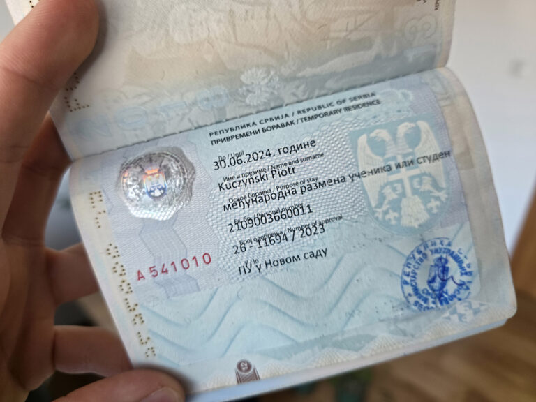 Стигавши у Нови Сад, почео сам с процесом добијања привременог боравка у Србији. То је документ који је потребан да би се остало у Србији више од три месеца – ја сам остајао девет, тако да су ми га морали залепити у пасош.