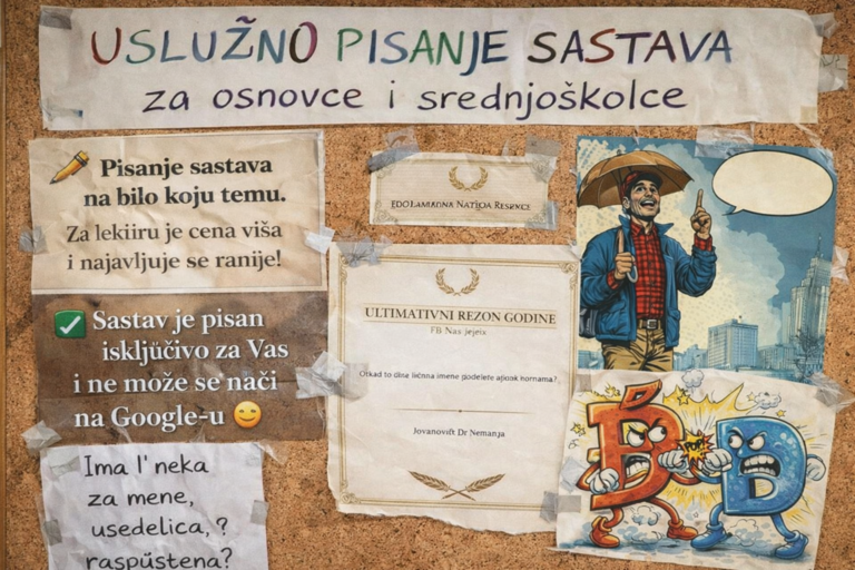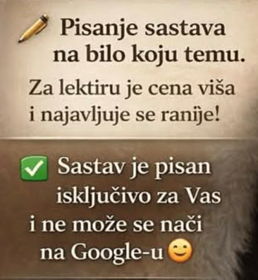 „Poštovani, ja sam admin grupe Naš jezik. Vaš oglas nismo mogli da objavimo jer je protiv pravila grupe, ali je jedna moja prijateljica koja ima ćerku i sina školskog uzrasta zainteresovana za vaše usluge. Najpre je prilično hitno za ćerku koja je šesti razred i ima vrlo nezgodnu nastavnicu srpskog i koja je za sledeći ponedeljak najavila pismeni zadatak i čak otprilike najavila teme. Ona uvek zada jednu temu iz gramatike i dve teme za pismeni koje su uvek neke apstraktne ili autorefleksivne, kako ih ona zove. Uglavnom, ta moja prijateljica kaže da je prošli put jedna od tema bila “Zašto ja postojim za druge”. Na nju je njena ćerka Anja i odgovorila i dobila četvorku uz obrazloženje da je rad dobar ali da nije odgovorila na temu jer se u radu ne spominju drugi nego samo ona sama. U ponedeljak će sigurno biti neka slična tema, a nastavnica im u petak uvek već nagovesti teme, a ponekad im tačno i kaže koje će biti teme. Ona pita koliko to košta i kako da se povežete. Kaže da će u petak popodne znati sve tri teme jer čak i kad nastavnica ne kaže deci šta će biti, ona to javi roditeljima. Treba reći i da je jako stroga i da proverava i stil i upoređuje ga ne samo sa postojećim radovima na internetu nego i sa AI pisanim zadacima.“